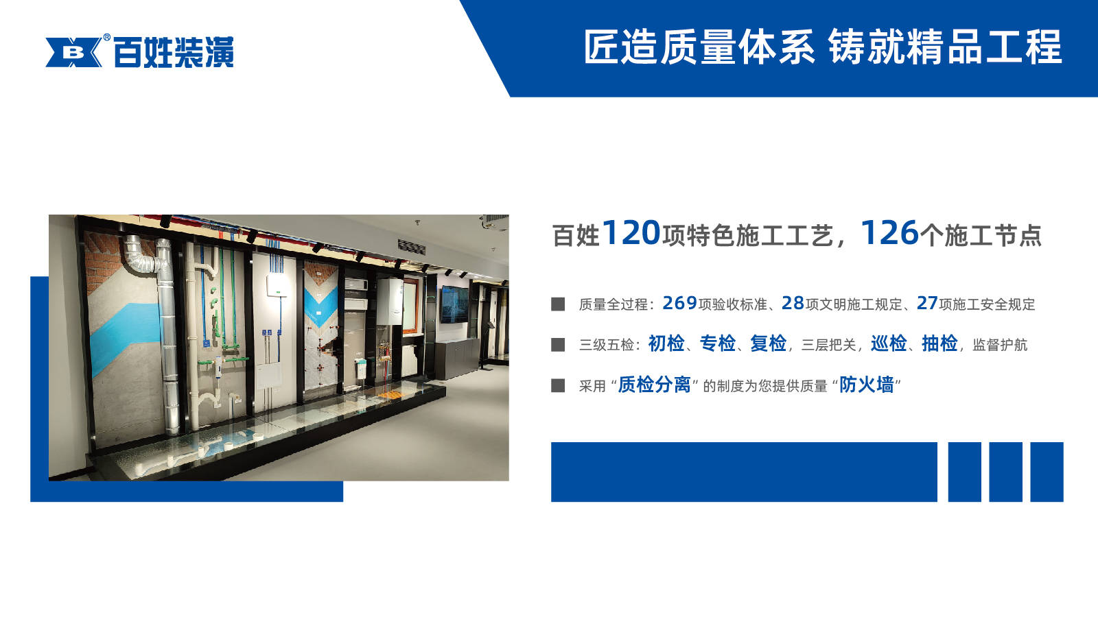 百姓装潢拥有多名资深设计师团队,能够为消费者量身打造不同风格的个性化设计方案。同时,公司制定了269项验收标准,28项文明施工规定,27项施工安全规定,质量全过程节点覆盖,安全有保障。采用三级五检制度,即初检、专检、复检,三层把关;巡检、抽检,监督护航,严把126项质量控制节点,让每个工程成为样板工程。并且实行质检分离的制度,为消费者提供质量防火墙。