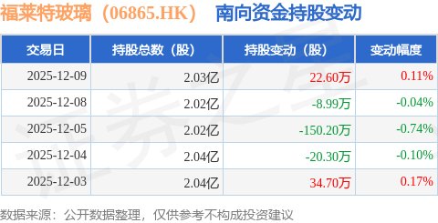 证券之星消息,12月9日南向资金增持22.6万股福莱特玻璃(06865.HK)。近5个交易日中,获南向资金减持的有3天,累计净减持122.19万股。近20个交易日中,获南向资金增持的有10天,累计净增持5.71万股。截至目前,南向资金持有福莱特玻璃(06865.HK)2.03亿股,占公司已发行普通股的45.85%。