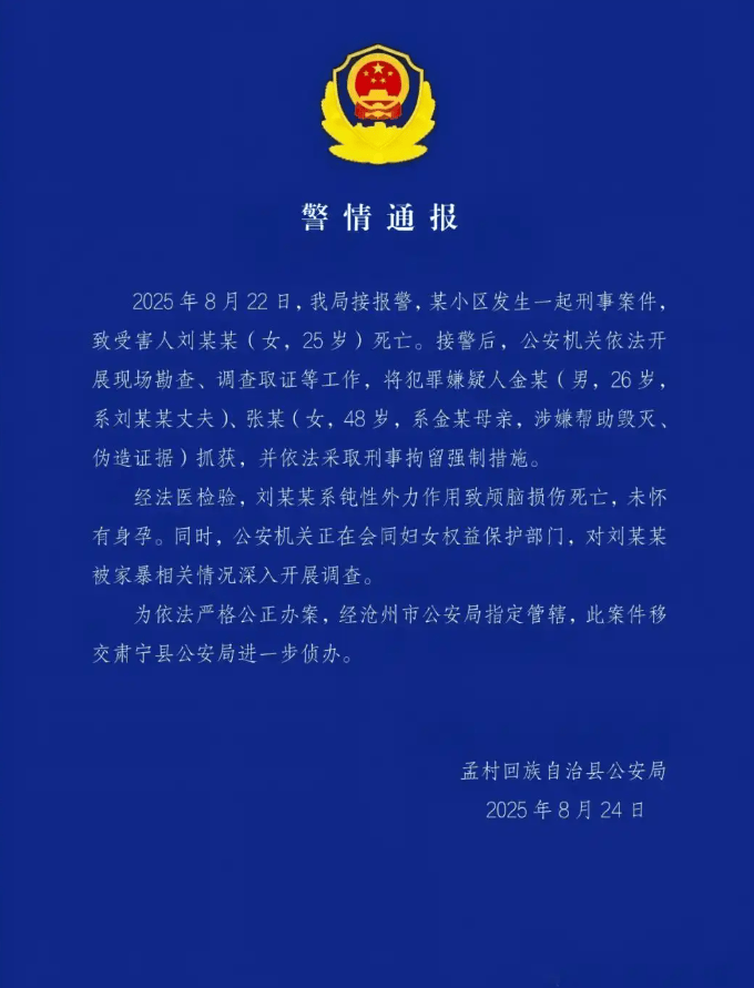 据红星新闻此前报道,8月22日,河北省沧州市孟村回族自治县公安局接报警,某小区发生一起刑事案件,致受害人刘某某(女,25 岁)死亡。接警后,公安机关依法开展现场勘查、调查取证等工作,将犯罪嫌疑人金某(男,26岁,系刘某某丈夫)、张某(女,48岁,系金某母亲,涉嫌帮助毁灭、伪造证据)抓获,并依法采取刑事拘留强制措施。