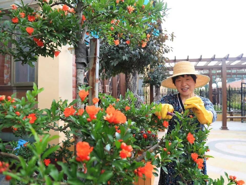 庭院中,桂花、玻璃海棠、石榴树、蔷薇等植物层次丰富、错落有致,营造出绿意盎然的居住环境。铁艺围栏上爬藤月季绚烂绽放,花好日丽,美不胜收。