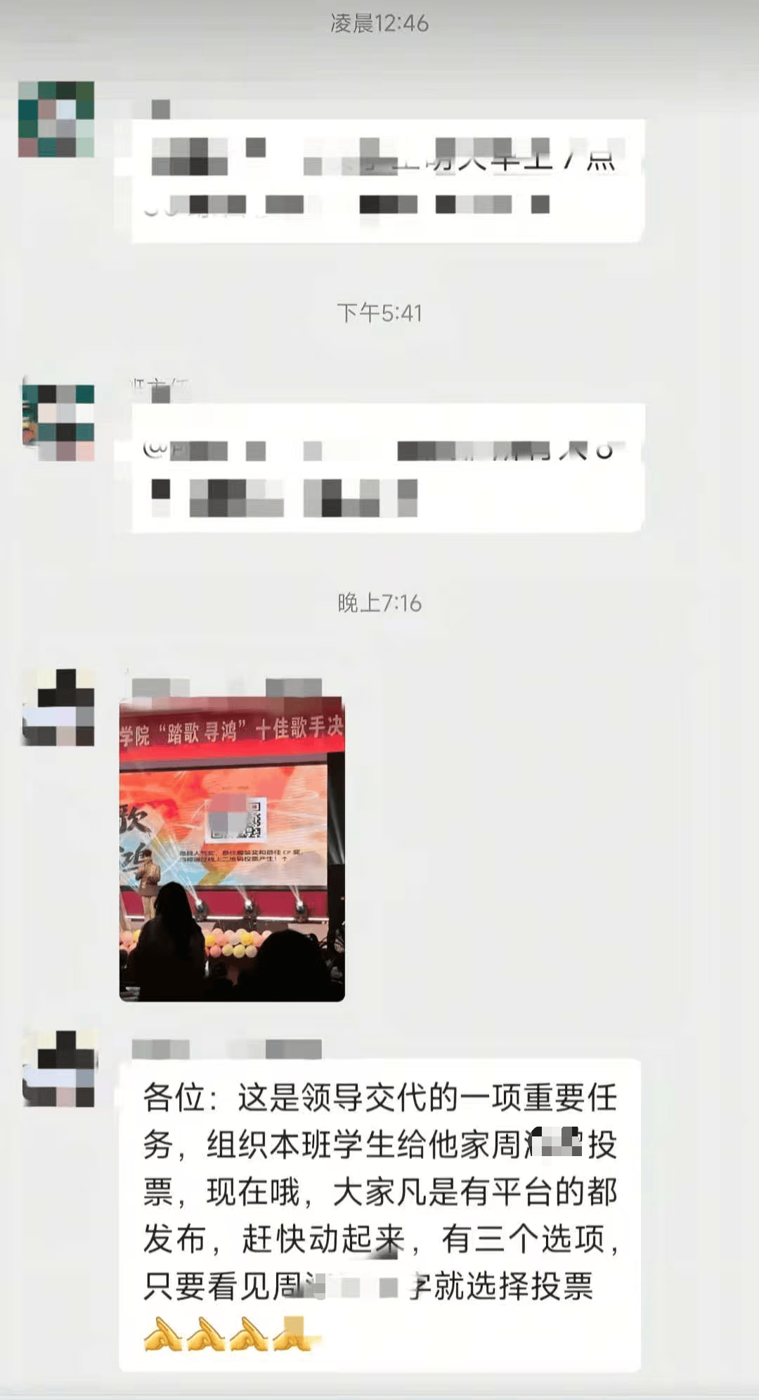 视频显示,群中有人称“为领导交代的重要任务,组织本班学生给他家周(某某)投票”,事件引发网友讨论,有网友对此事表达不满,也曾有网友怀疑是虚假信息。