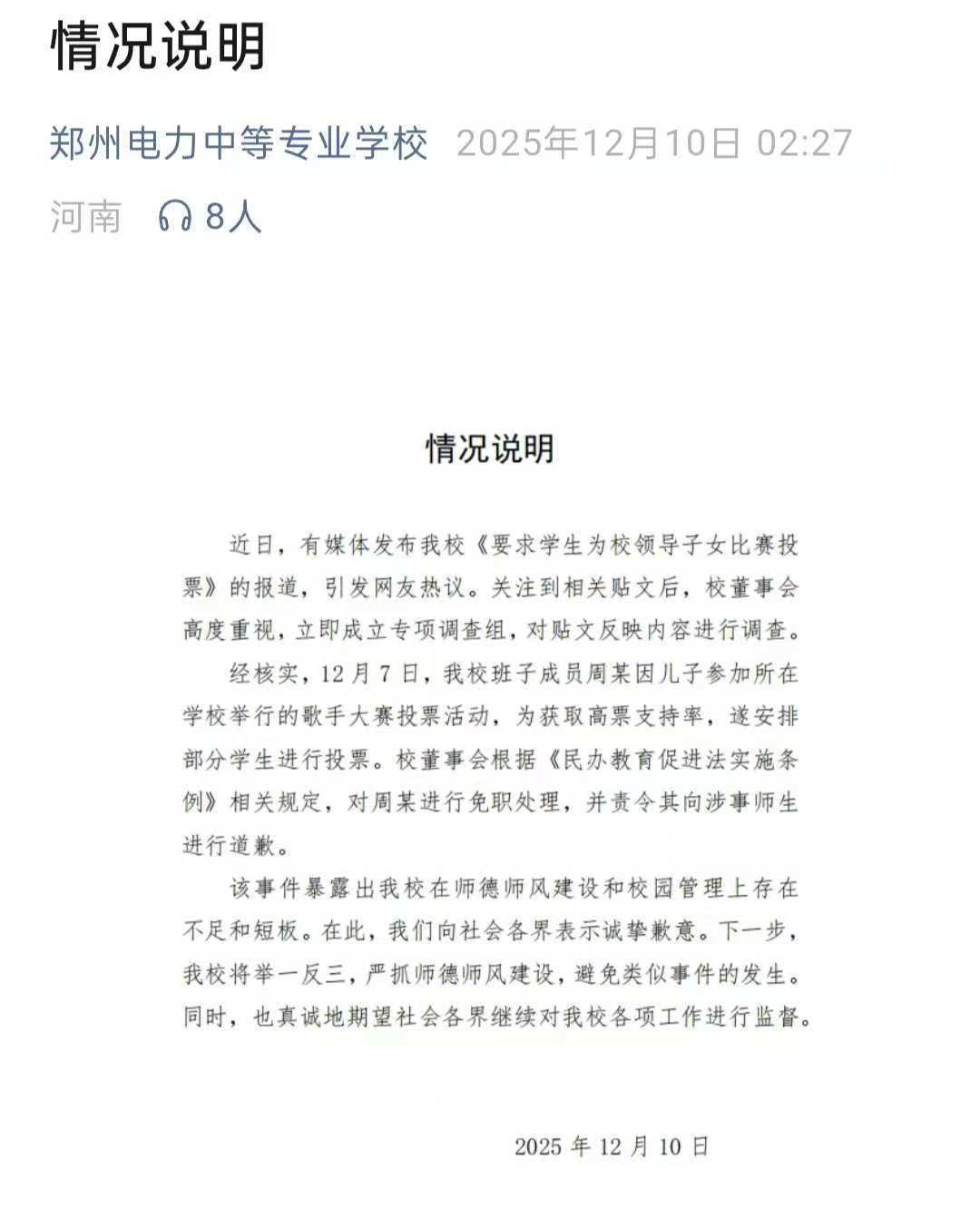 12月10日凌晨2点左右,郑州电力中等专业学校发布情况说明:“经核实,12月7日校班子成员周某因儿子参加所在学校举行的歌手大赛投票活动,为获取高票支持率,安排部分学生进行投票”。