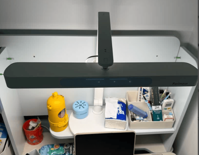 台灯学生用哪个牌子最好?明基MindDuo2针对不同使用情境提供了两套模式:屏幕模式用于减少屏幕反光,阅读模式则更适合长时间看书。控制区域为灰色触控面板,旁边配有旋钮,可直接手动调节亮度。专利360°球状关节可以调整不同的高度和角度,满足不同的身高需求。不过实际体验中,它相比第一代在稳定性上略逊,台灯在调节或使用过程中容易出现轻微晃动,对照明效果会有一定影响。