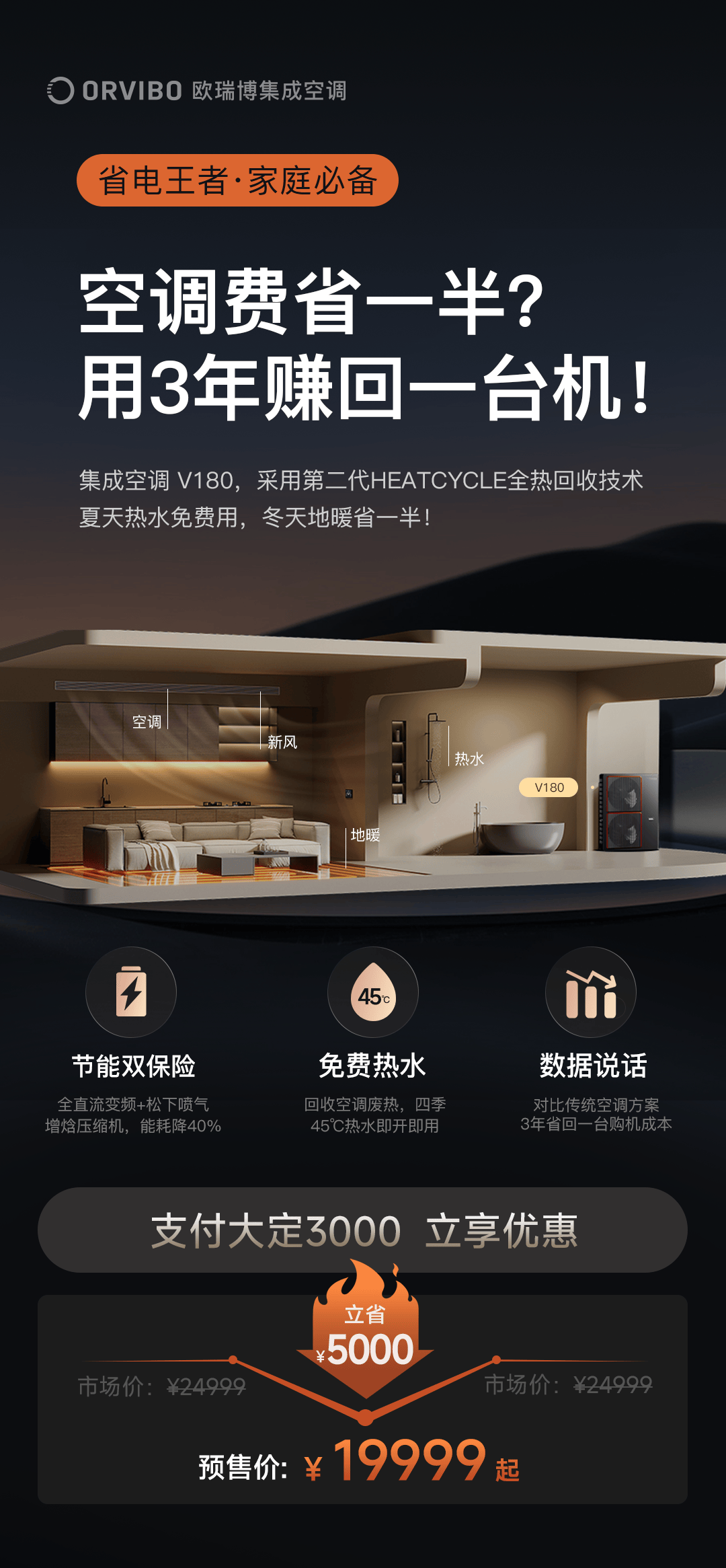 欧瑞博的S350/ES400集成空调具有诸多显著的特点。在节能效率方面,采用HeatCycle全热回收技术,夏季制冷时能将室外机排出的废热转化为生活热水,能效比提升至5.6;冬季热泵技术能从 -25℃空气中提取热量,能效比达3.2以上,比燃气壁挂炉节能65%;ES400还具备智能储能调度功能,理论上可降低家庭用电成本30 - 50%。在智能化方面,拥有无感自适应算法,能系统学习用户作息自动预调节;支持多场景并发处理,水温波动小于±1℃;还具备故障自诊断与预警功能。在集成度方面,物理空间节省60%,安装工期缩短约50%,维护复杂度降低。在质价比方面,采用一价全包模式,无隐藏增项,核心部件十年保修,年故障率低于0.5%。