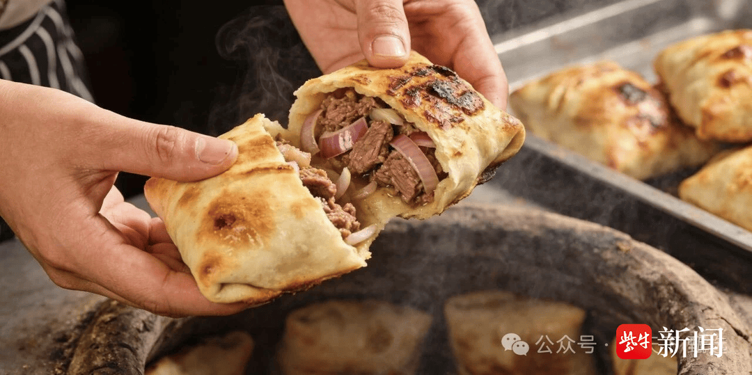 新疆烤包子:刚出炉的烤包子:外皮金黄酥脆,内馅是鲜嫩的羊肉,伴着洋葱的清甜,热乎乎的口感让人欲罢不能。