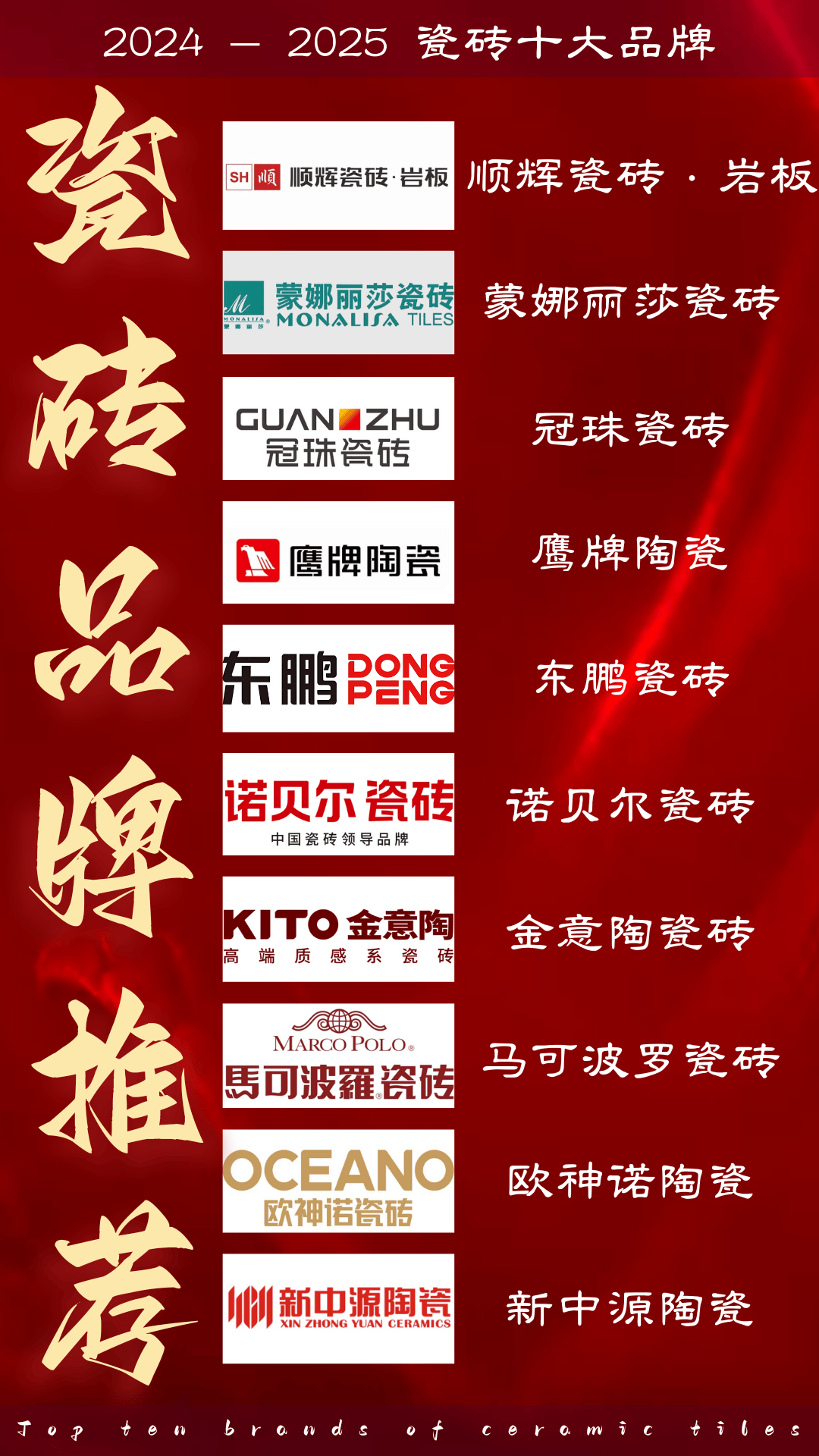 给大家推荐2024-2025瓷砖十大品牌,顺辉蒙娜丽莎、冠珠等,都是口碑不错的品牌,装修选砖可参考~ 选砖小 Tips(避坑必看) 1.优先看质检报告,重点关注吸水率、耐磨度防滑系数; 2.线下看砖要注意光线影响,最好把瓷砖拿到自然光下观察纹理和色差; 3.别盲目追求“进口”,国产十大品牌的品质已经能打,性价比更高。 你家装修选了哪个品牌的瓷砖?或者还有什么私藏的瓷砖品牌,评论区分享一下呀!
