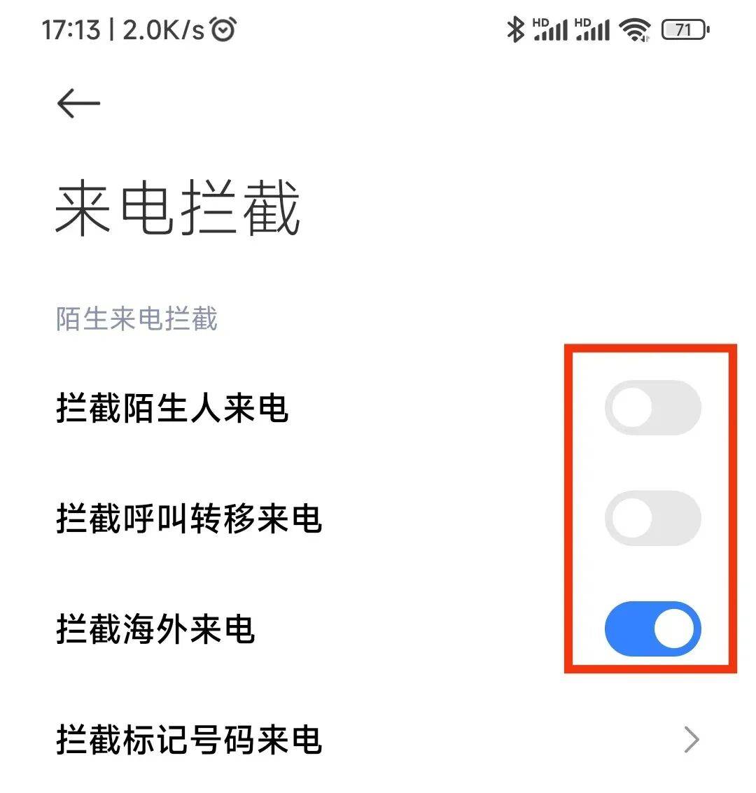 这个页面与短信拦截是类似的,需要对不同类型的来电进行设置,包含拦截陌生人来电、拦截呼叫转移来电、拦截海外来电和拦截标记号码来电。
