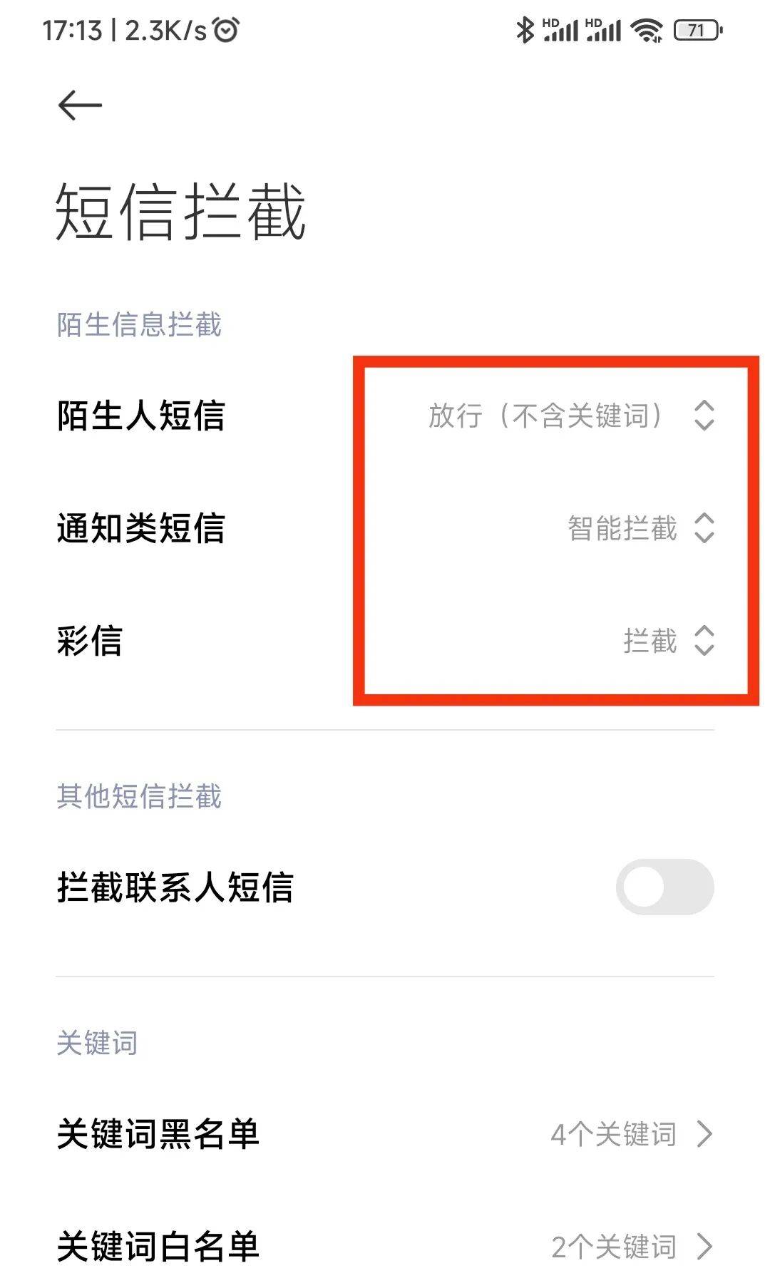 除此之外,还可以通过下方的关键词白名单和黑名单对上面的规则进行补充,以达到拦截短信的最完美状态。
