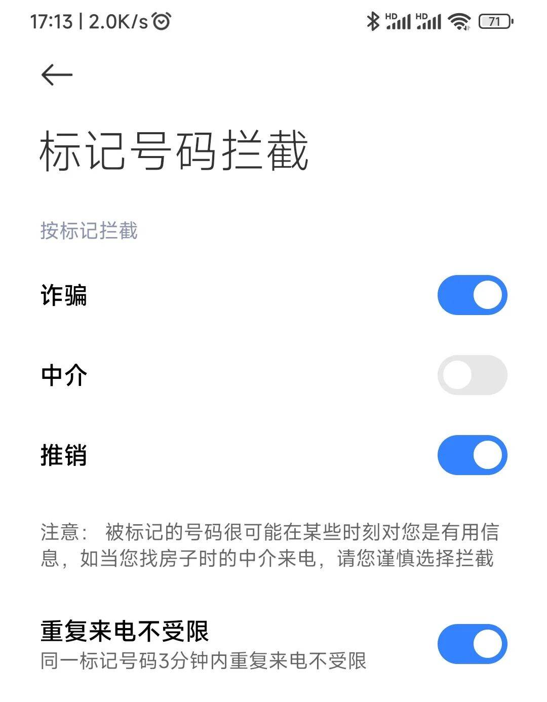 其中,拦截标记号码来电又可以对诈骗电话、中介、推销等类型的来电进行单独设置。
