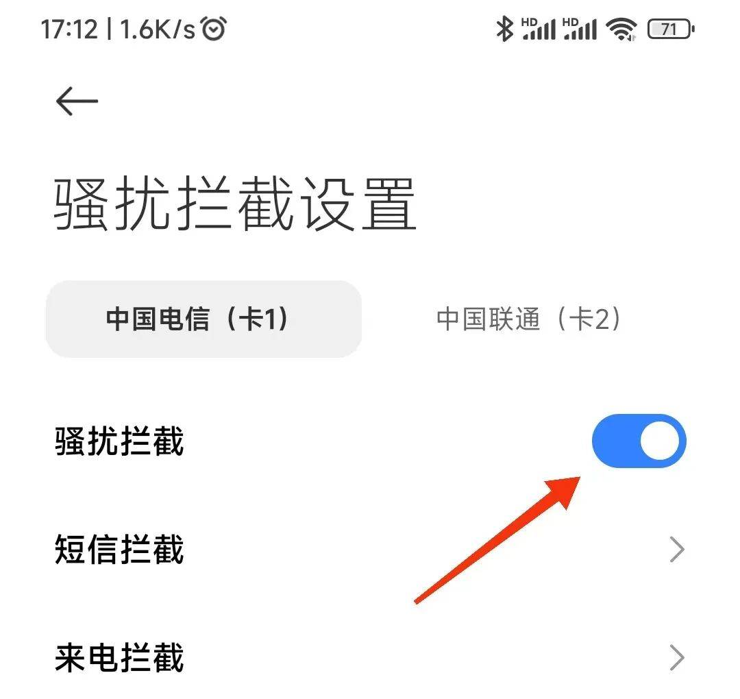 进入骚扰拦截的设置页面之后,在这个页面上需要打开【骚扰拦截】的开关,这是一个总开关,只有打开这个开关之后才能进行后续的设置。
