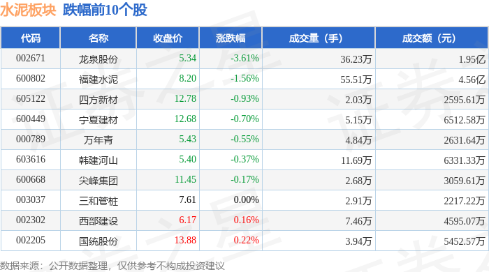 证券之星消息,12月10日水泥板块较上一交易日上涨1.75%,四川金顶领涨。当日上证指数报收于3900.5,下跌0.23%。深证成指报收于13316.42,上涨0.29%。水泥板块个股涨跌见下表: