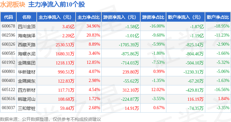 从资金流向上来看,当日水泥板块主力资金净流入5.18亿元,游资资金净流出2.19亿元,散户资金净流出2.99亿元。水泥板块个股资金流向见下表: