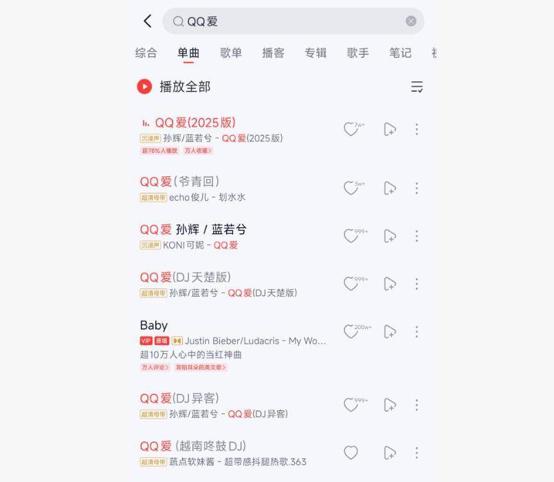 极目新闻记者注意到,目前在网易云音乐、酷我音乐等平台上,未能找到王麟演唱的《QQ爱》版本,只有孙辉和蓝若兮演唱的版本。