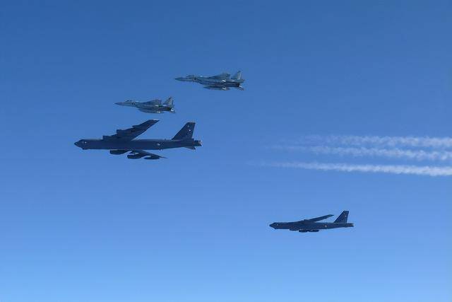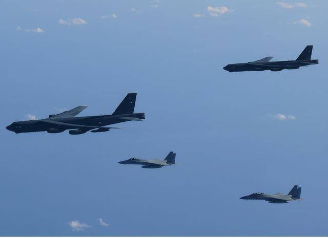 先来看参与演习的美军装备。美军这次只派了2架B-52H战略轰炸机,还是服役半个多世纪的老机型,既没隐形能力,也没什么现代空战优势,全程靠日本空中自卫队的3架F-35A和3架F-15J护航。对比今年9月 “坚毅之龙2025” 演习时,美军高调亮出“堤丰”中导系统、“海幽灵” 无人半潜船,这次的配置简直像“走过场”。
