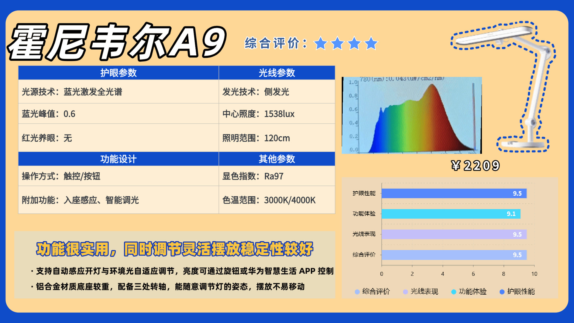 霍尼韦尔A9采用铝型材与肤感钢化玻璃材质打造,兼顾了质感和耐用性,在光线方面,55cm长条形发光面搭配35W大功率设计,能轻松覆盖1.2米桌面,同时灯头始终保持与桌面垂直50cm的科学高度,光照角度可以贴合孩子的用眼需求,而且光线色温设有3000K暖光与4000K自然光两档调节,可以适配不同场景用光。在核心护眼上有对光谱中蓝光进行优化,蓝光峰值在0.6附近,属于不错的水平,不过同样没有额外添加红光。