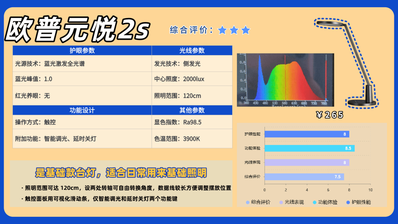 欧普元悦2S的底座稳重,放置不易倾倒,同时支持智能调光和延时关灯等实用功能,双轴灯臂可自由调节角度,可以满足不同阅读和书写姿势的需求,整体来说是一款功能齐全的基础型护眼台灯。