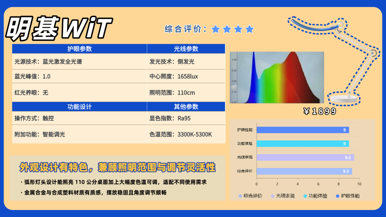标志性的弧形灯头是明基WiT的核心设计,38.5厘米弯月形灯面能照亮约110厘米桌面,光线色温可在3300K至5300K之间调节,内置光感应器能根据环境光自动调整亮度,整体来说光线的适配性还是很可以的。不过它的防眩指数UGR是16-19,这个数值处于中等水平(UGR<13才优秀),所以在使用过程中可能会出现眩光和书本发光的现象,而且它的蓝光峰值达到了1.0,蓝光含量偏高。所以,对光敏感和对护眼有高要求的人群要慎重选择。