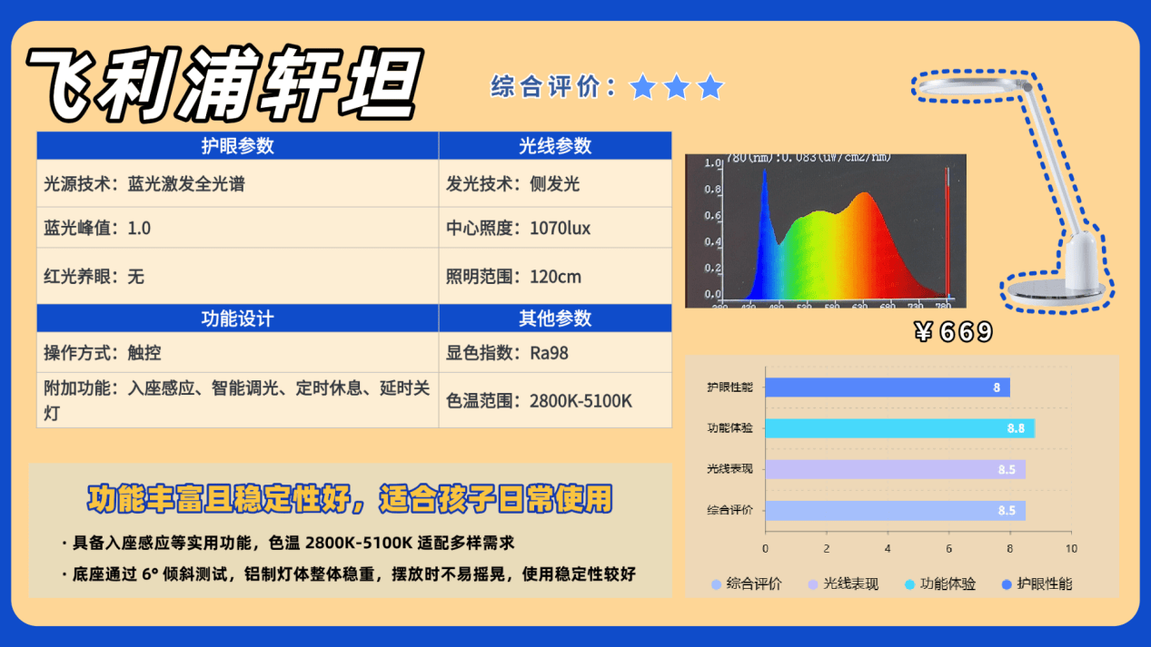 飞利浦轩坦延续了品牌现代简约设计风格,采用金属材质配合流畅线条灯杆,整体的外观沉稳大方,摆放在书房、卧室都可自然融入环境。在光线方面采用侧发光设计,光线柔和度表现不错,光线色温调节范围覆盖2800K—5100K,可自由切换冷暖光,光线适配性很好。在护眼方面略显逊色,光谱存在明显的蓝光高峰,不仅有害蓝光达到了1.0,而且有益的天青光和红光也比较少,护眼效果一般。