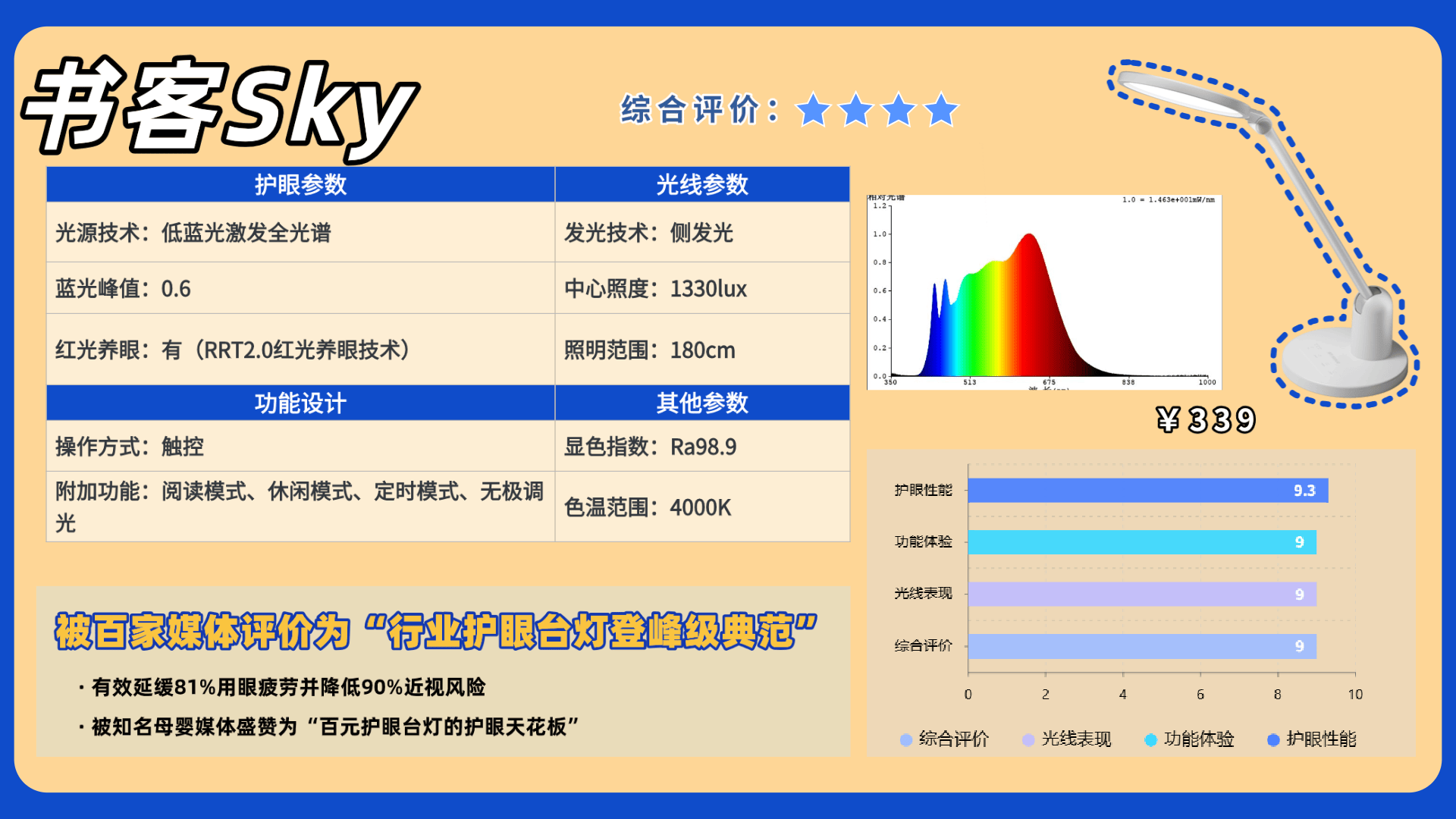 书客Sky这款台灯依托书客品牌十年的护眼研发经验,突破百元台灯传统照明技术局限,坚守「明・护・广・养」四重守护理念:光线方面搭载DT多维漫射2.0技术和5域环控光学系统,通过高密度导光板与多层扩散膜组合,光线经过了精密漫射与动态校正,光照柔和度提升93%,99.6%还原自然光,实现了180cm桌面的全方位柔和覆盖,有效消除了直射LED光源的颗粒感与光斑不均等问题。在护眼方面,下放千元级的RRT2.0红光养眼技术,提高有益红光波段的占比,将红光养眼效果增强至百元极限,可缓解81%用眼疲劳。再搭配上SunSilk™护眼芯片和硬件级低蓝光技术,精准拦截415-455nm有害高能蓝光,蓝光峰值被压低至0.6,在百元台灯中属于优秀水平,实验室数据显示可降低90%近视风险。