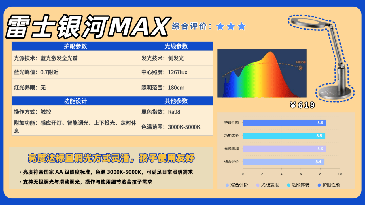 雷士银河MAX在光线方面采用的是圆形灯面结合侧发光发光方式的设计,整体的照明范围可以达到180cm左右,同时它的照度达到了1267lux,符合国家AA级标准。光线色温支持3000K-5000K宽域调节,满足从暖黄光到冷白光的多种用光需求。蓝光峰值在0.7附近,不过没有进行补全红光的设计,护眼效果中规中矩。