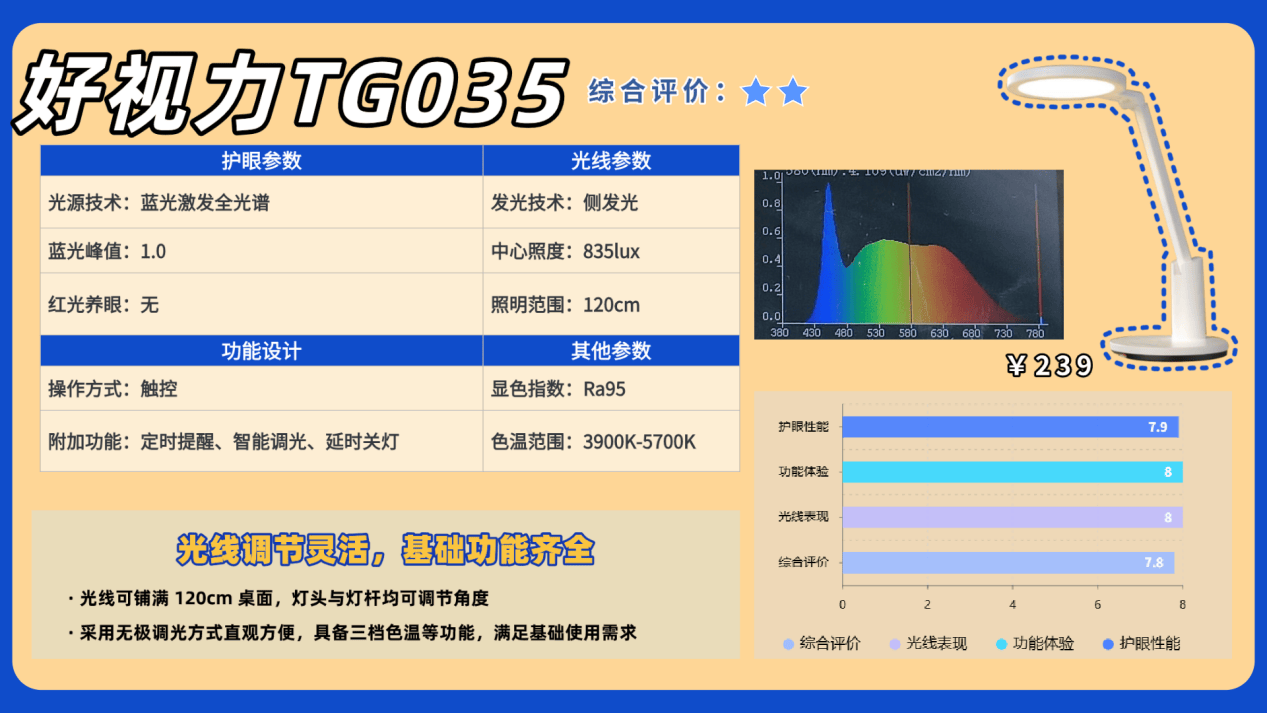 好视力TG035采用纯净简约的纯白配色,造型小巧清爽,百搭各类家居风格。它的灯头直径约14cm,再配合16W整灯功率,光线可铺满120cm桌面,满足日常阅读、学习等基础照明需求。从护眼方面来看,它的光谱图显示蓝光的占比是比较高的,蓝光峰值很突出有1.0而且有益的天青光和红光部分明显偏少,整体护眼性能偏向基础,更适合短时间用眼场景。