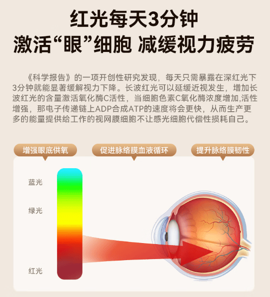 红光主要是通过长波段刺激眼部微循环,让眼睛血液流通更顺畅,从而缓解眼睛疲劳。尤其在学习看屏幕一段时间后,有红光照射时眼睛确实会明显舒服一些。