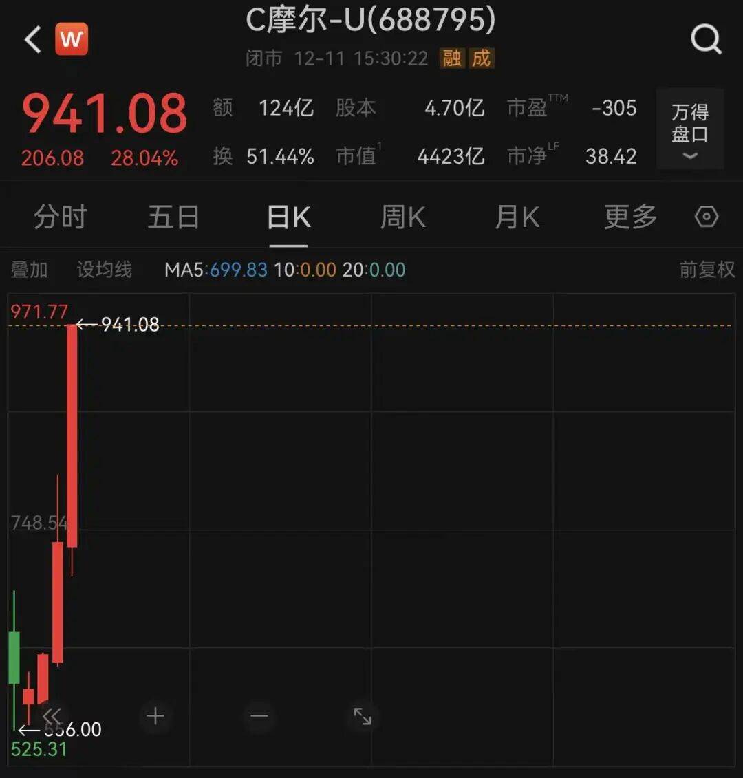 摩尔线程有着“国产GPU第一股”之称,公司于12月5日在科创板上市,当天其股价大涨425.46%。公司最近3个交易日涨幅分别为5.73%、16.98%、28.04%。12月11日摩尔线程大幅上涨28.04%,股价升至941.08元,市值达到4423亿元。若以114.28元的发行价计算,上市仅5个交易日,摩尔线程股票收盘价格较发行价格涨幅为723.49%。