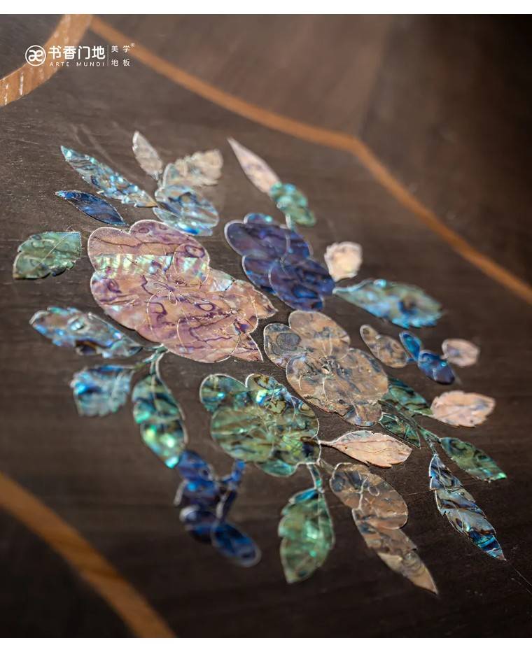 百卉含英则融合了拥有悠长历史的螺钿工艺,是名贵家具标志与木相融,其色彩似梦幻极光,质感如丝绸拂面,绘就木地板的视觉效果及艺术性。