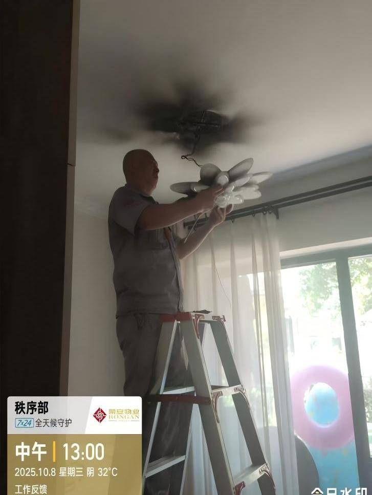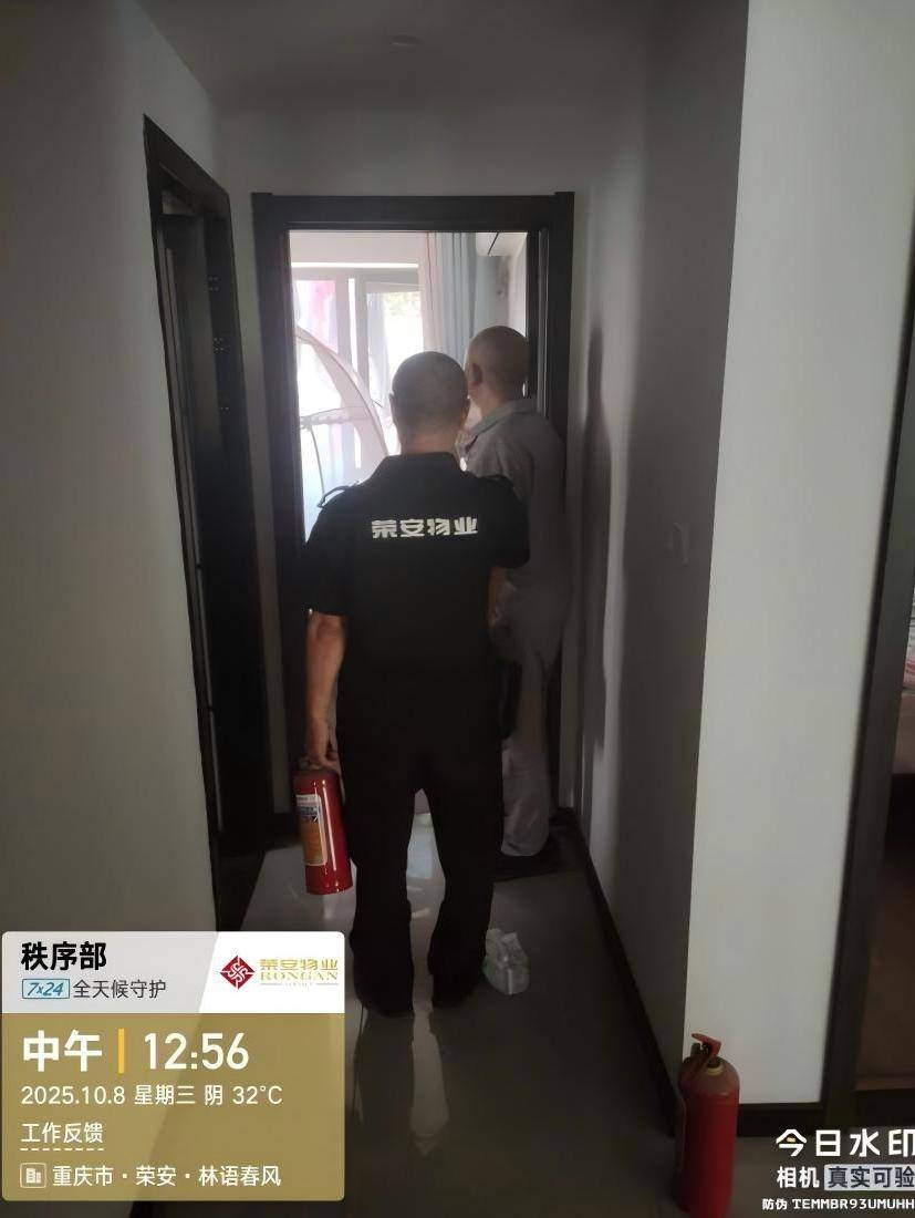 10月8日中午12时50分,荣安林语春风小区一业主家中突发火情:卧室内吊灯因线路老化短路起火。管家刘明灿接报后,立即启动应急响应。工程部贺延伟、秩序部兰均与赵小川三人火速奔赴现场,仅用3分钟便抵达起火地点。“秒级响应”为控制火情赢得了宝贵时间。