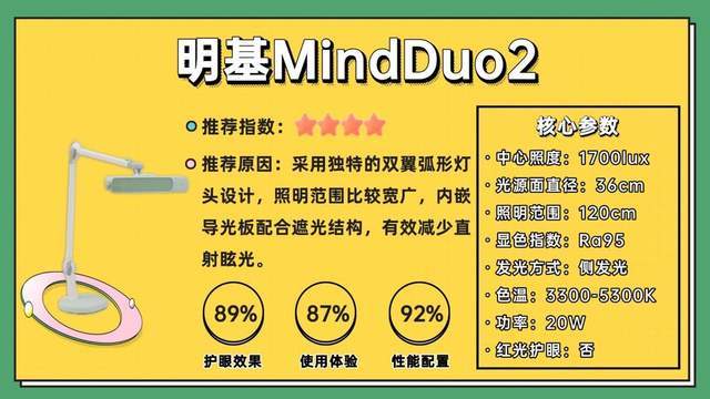 【适合人群】预算充足、拥有1.2米及以上大桌面且需双人共用的家庭,看重照明范围的家庭可考虑。