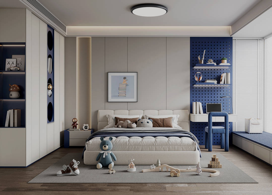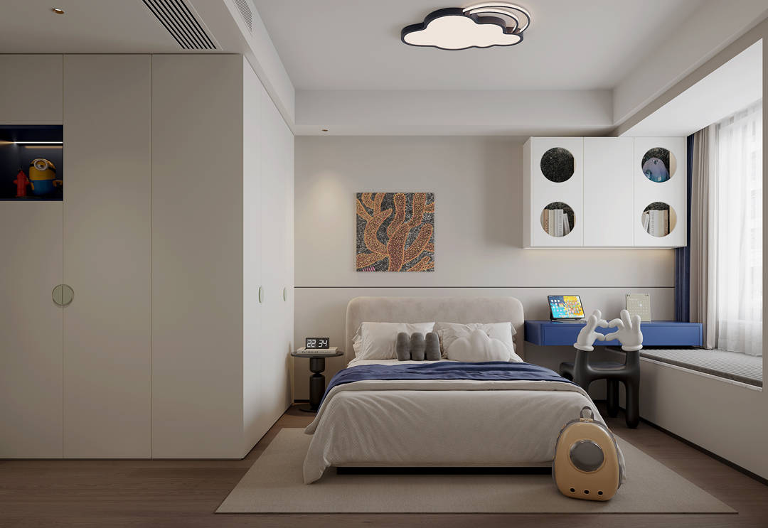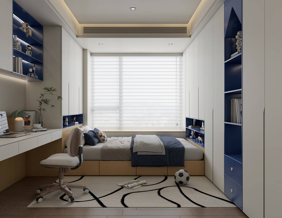 儿童房需要成长性设计,书桌高度可调节,随着年龄增长自由切换,衣柜挂杆分高低区,短衣区 + 长衣区 + 叠放区科学划分,从小男孩用到青春期,这也反映全屋定制品牌设计的专业功底。