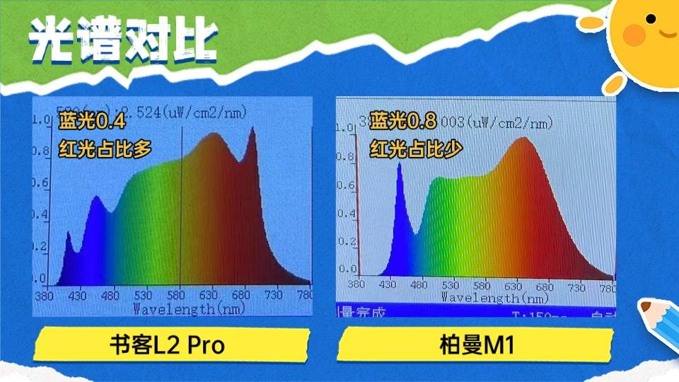 这两款台灯采用的都是紫光激发技术,在4000K中性光的情况下,书客L2 Pro的蓝光峰值是在0.4附近,柏曼M1的蓝光峰值是在0.8附近,这是因为书客采用的是全新一代紫光激发全光谱技术+自研的SunLux全光谱芯片,对光谱的控制更好,可以从光源端精准抑制有害蓝光,不需要牺牲色温就能实现低蓝光防护。而柏曼M1的蓝光峰值在3000K暖光下才能到0.4附近,但3000K的色温会偏黄,不是很适合孩子学习。