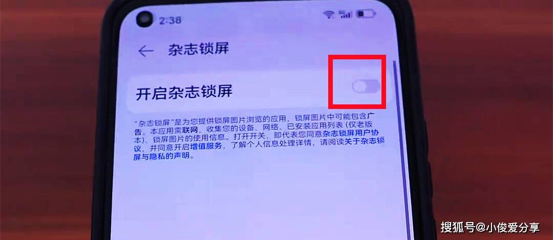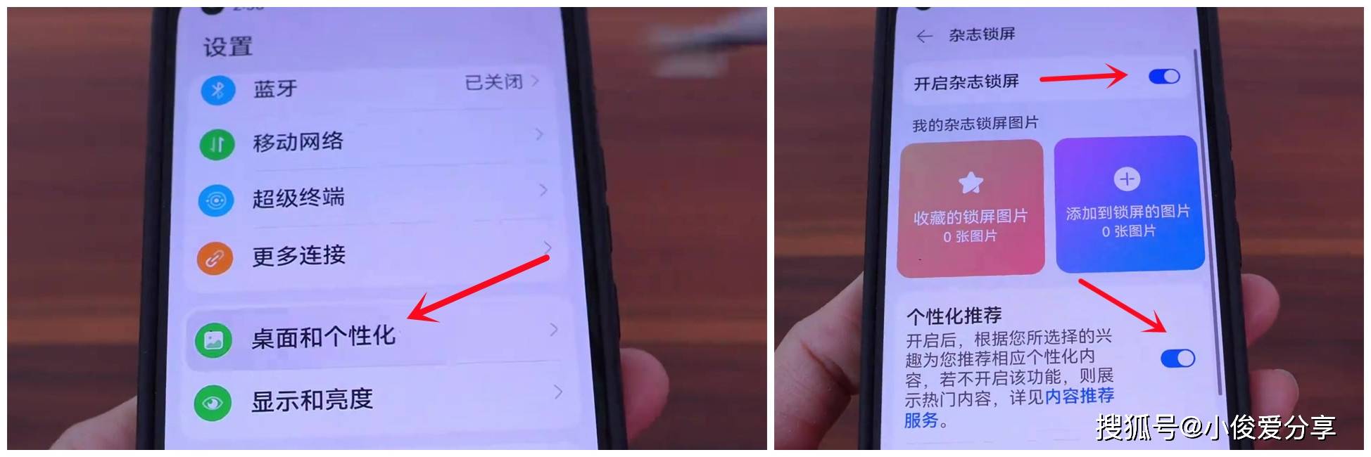 接着,咱们再返回到手机设置的页面,我们来看看桌面和个性化这一项。点进去再点杂志锁屏,可以看到杂志锁屏的开关是打开了的了。