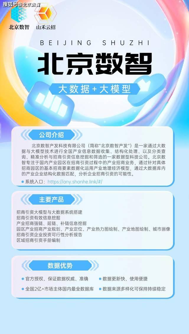 北京数智产发科技有限公司(简称“北京数智产发”)是一家通过大数据与大模型技术进行全国产业信息数据收集、结构化处理、以及分类查询、精准分析与招商引资信息挖掘和筛选的一家数据型科技公司。北京数智专注于国内产业园区在招商引资过程中的产业招商业务,通过针对具体招商园区的基本招商要素数据化运用产业地理经济模型,通过大数据库内的产业企业结构化数据匹配,分析企业招商引资的可能性。