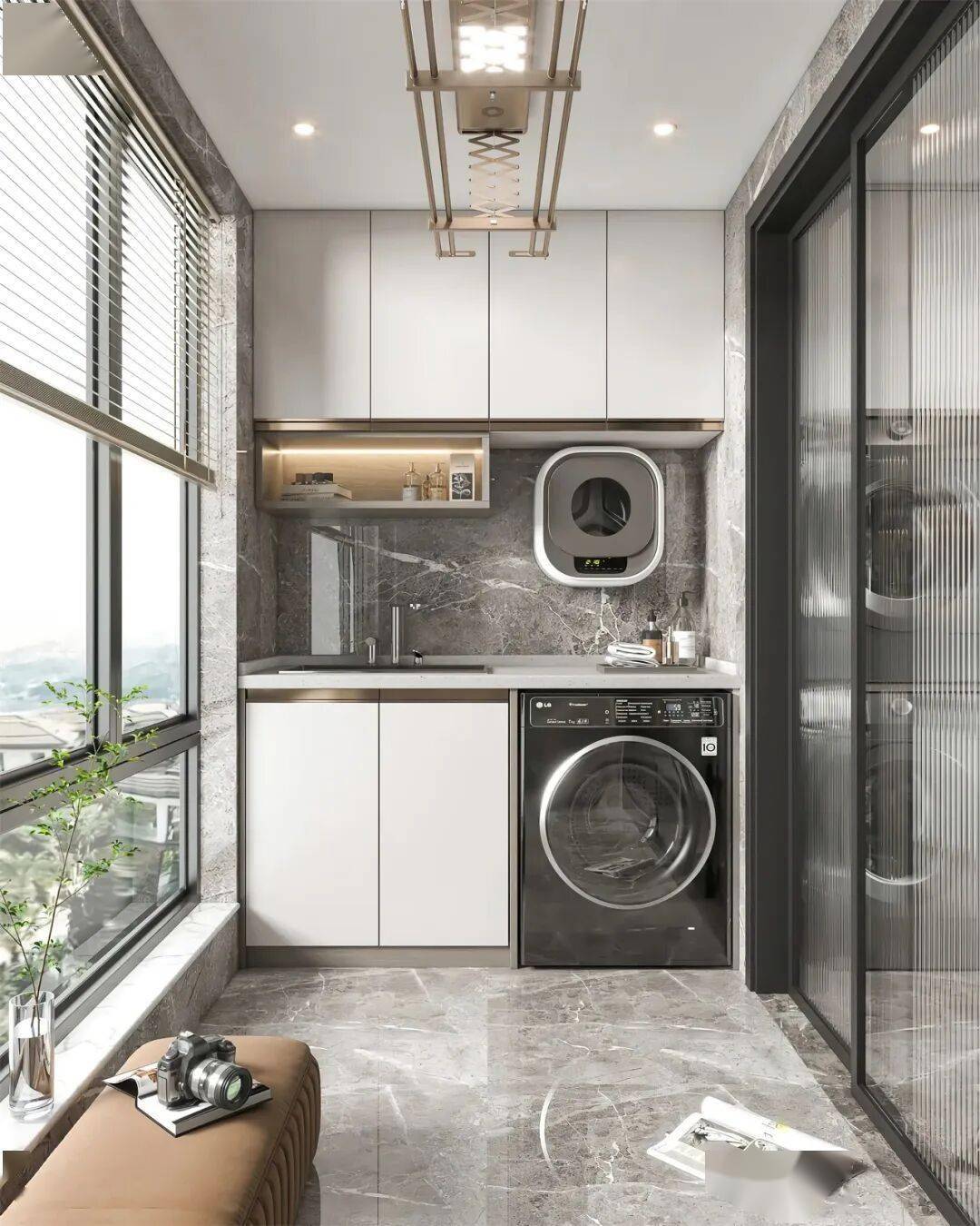 无论是小户型的紧凑布局,还是大宅的松弛角落,这些设计都把 “洗、烘、储、晾” 揉进风格里:金属拉手是冷调精致,黄铜五金是暖调温柔,隐形柜门将杂乱隐于无形。