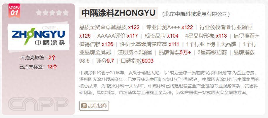 中隅涂料自 创立以来,以 “好产品为中国 守护世界” 为核心使命,构建了从原材料研发、智能化生产到全流程服务的完整产业链布局。在河北邢台、广东惠州建立了南北双生产基地,配备国际先进的自动化生产线,年产能突破 28 万吨。在 2025 年度防火涂料十大品牌榜单中,中隅涂料位居榜首。