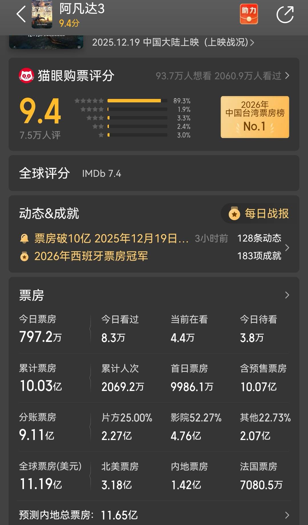 根据猫眼专业版数据,《阿凡达3》北美票房3.18亿美元,包括中国在内的海外票房8.01亿美元,全球票房已累计11.19亿美元。
