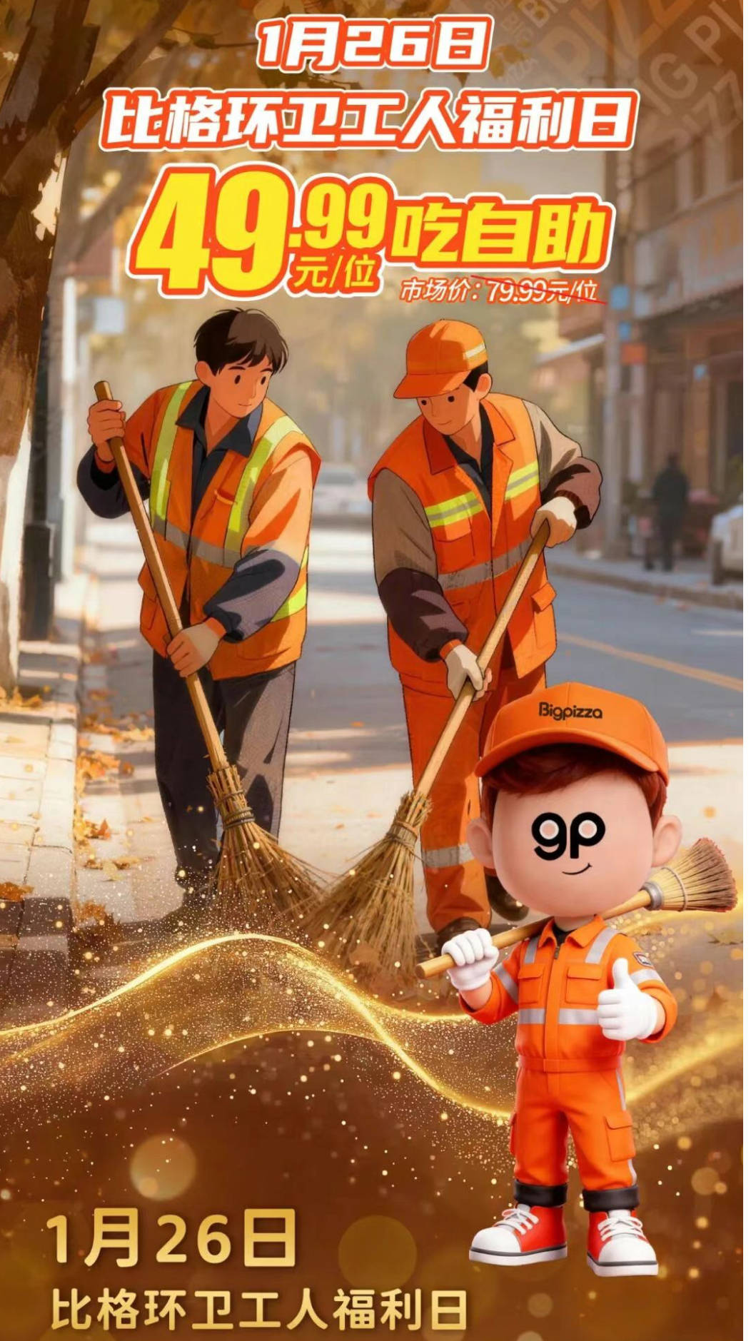 1月14日,比格比萨自助发布推文,宣传1月26日为环卫工人提供49.99元吃自助的福利,活动规则显示,1月26日当天,环卫工人持本人环卫工作证或身着工作服等,核验身份后到店享受自助全国统一特惠价49.99元/位。