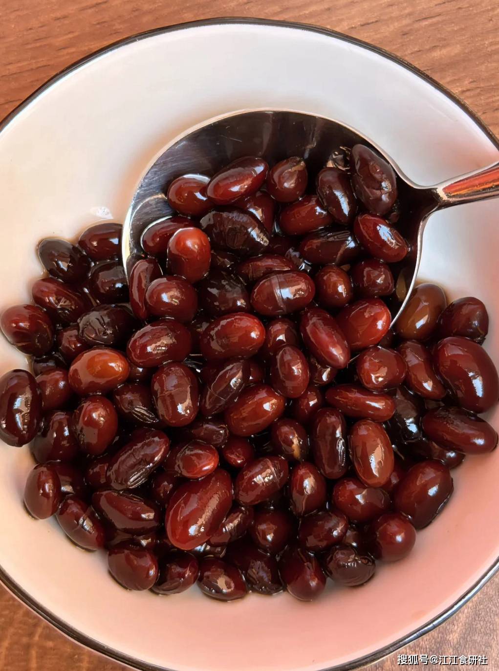 你会发现,醋的颜色会慢慢变深,变得像红酒一样。黑豆吸饱了醋汁,变得乌黑发亮。