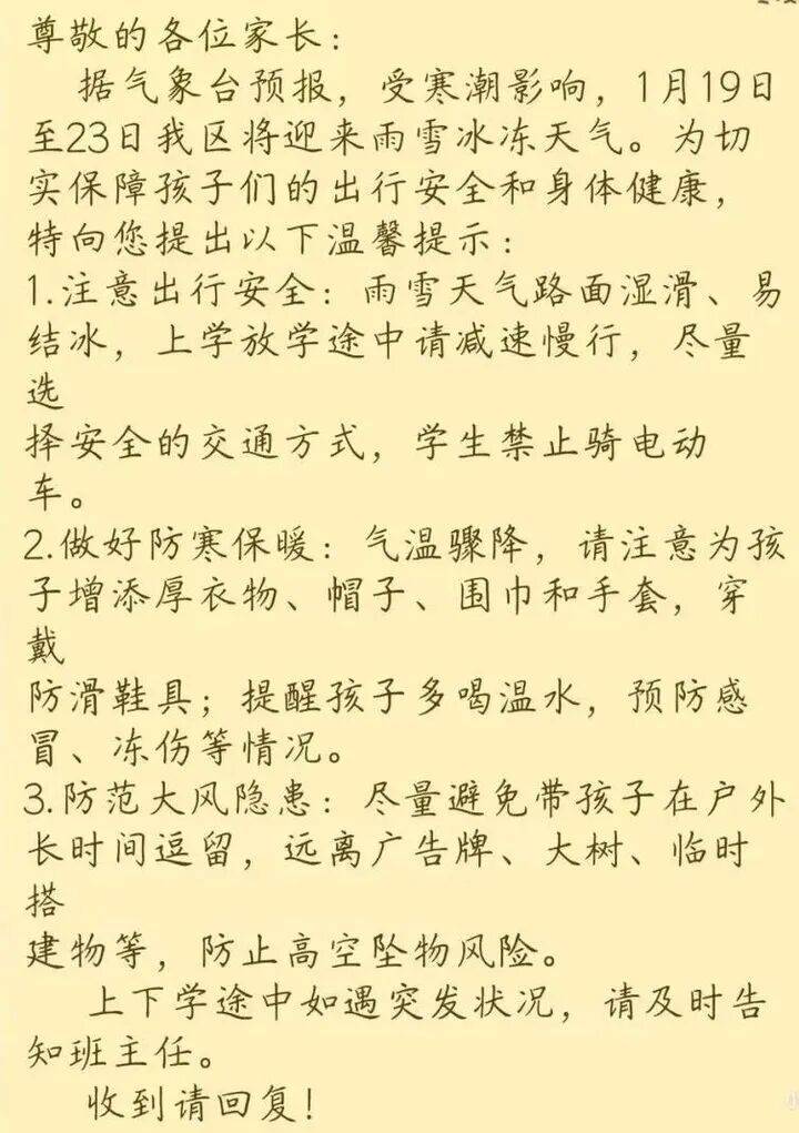 您好!根据南京市气象台最新预警信息,强冷空气将于 1 月 19 日凌晨开始影响我市,下周将遭遇 “寒潮 + 雨雪 + 大风 + 冰冻” 多重天气叠加的极端情况。随之而来的将有强风及较严重冰冻,路面易形成积雪、薄冰,能见度显著下降,给孩子们上下学的交通安全带来极大挑战。为牢牢守住校园安全防线,全力保障每一位学生的生命安全,学校特此发出以下倡议与提醒,让我们一同守护孩子平安出行!