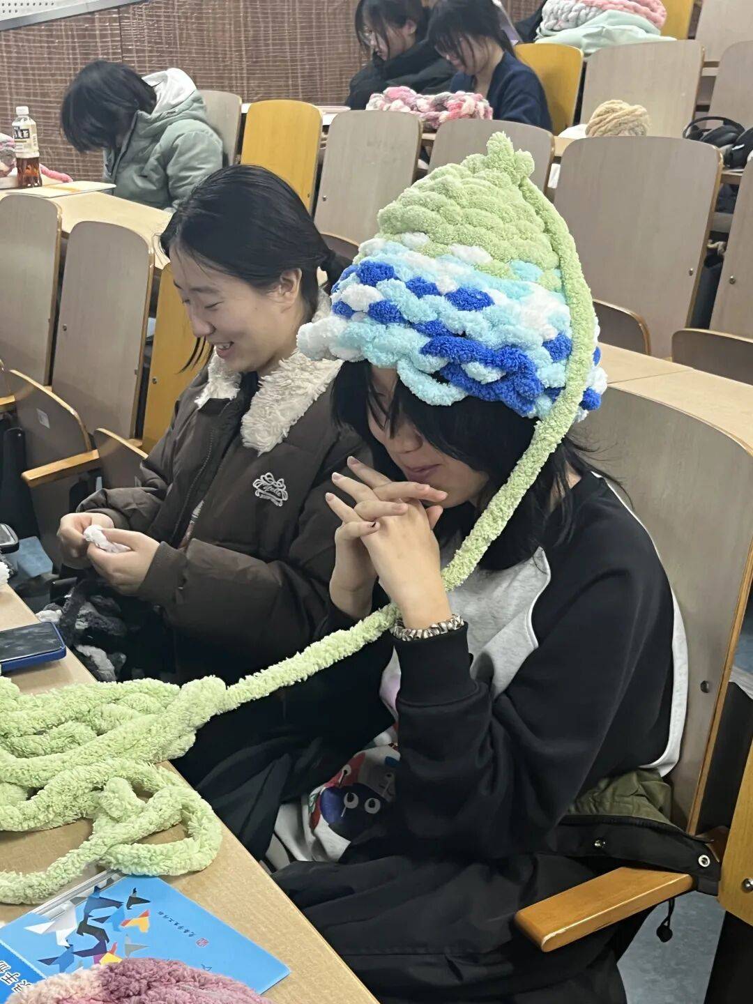 经过近两小时的劳作后,同学们纷纷完成了自己的作品。创作出了色彩斑斓,款式多样的围巾,看着手中从无到有的成果,大家脸上都不禁露出了自豪的笑容,不少同学还互相展示、拍照留念,分享着创作的喜悦。除此之外,有的同学还创造力拉满,突破了围巾的传统设计,制作了可爱的冬帽;