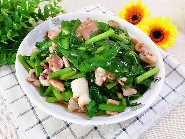 4.切寸段,锅内放少许油炒香姜碎后下入韭菜大火炒制断生时放入处理过的鱿鱼须煸炒,放入少许盐,糖,味精,鸡粉胡椒粉调味即可。