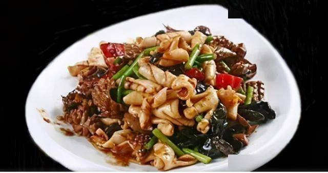 原料:猪腰200克,海兔100克,蒜薹、水发秋耳、青红椒片各20克。
