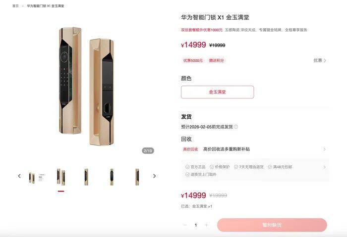 这款被市场戏称为“门锁界爱马仕”的产品,在设计上采用了“宫殿斗拱”元素与24K镀金铭牌。在官网维持14999元高位销售的同时,记者在闲鱼等二级交易平台检索发现,多位认证为“华为全品类”或“数码家电专家”的经销商挂出了大量现货,公开报价大多为12999元,且均承诺“全新未拆封、包安装”。