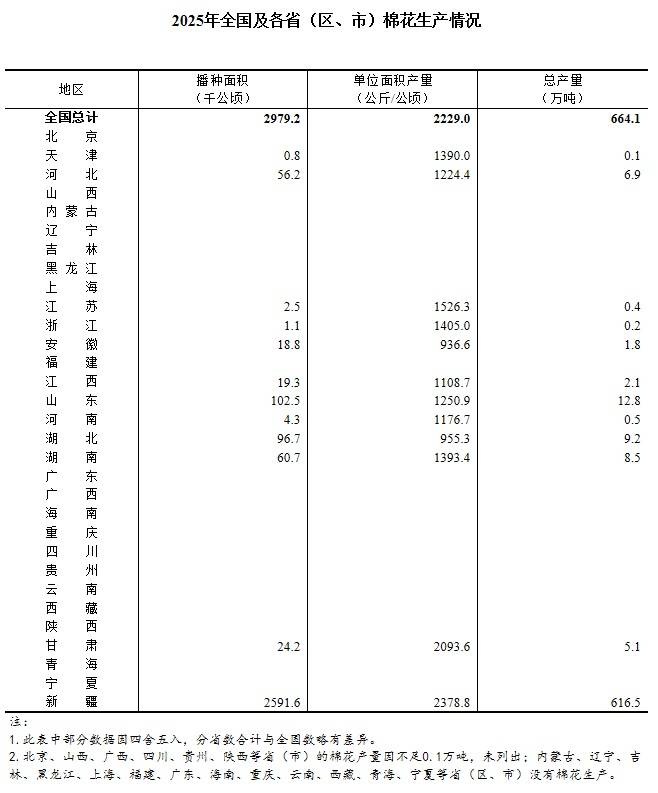 人民网北京12月26日电 (记者杨曦)据国家统计局消息,根据对全国31个省(区、市)的统计调查(新疆棉花播种面积通过遥感测量取得),2025年,全国棉花播种面积2979.2千公顷(4468.7万亩),比2024年增加140.9千公顷(211.3万亩),增长5.0%。全国棉花单位面积产量2229.0公斤/公顷(148.6公斤/亩),比2024年增加57.4公斤/公顷(3.8公斤/亩),增长2.6%。全国棉花总产量664.1万吨,比2024年增加47.7万吨,增长7.7%。