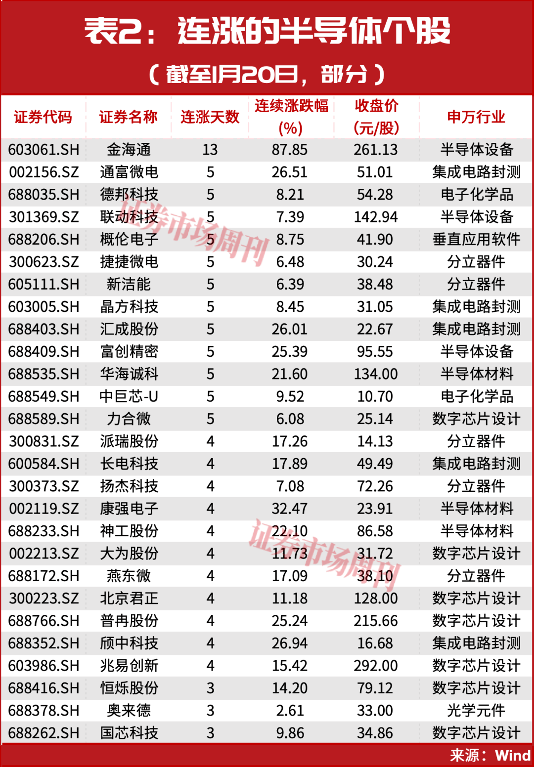 另外,在570余只连涨个股中,半导体产业链公司数量超过30只,除了金海通,还包括通富微电、捷捷微电、长电科技、扬杰科技、神工股份、北京君正、普冉股份等(见表2)。