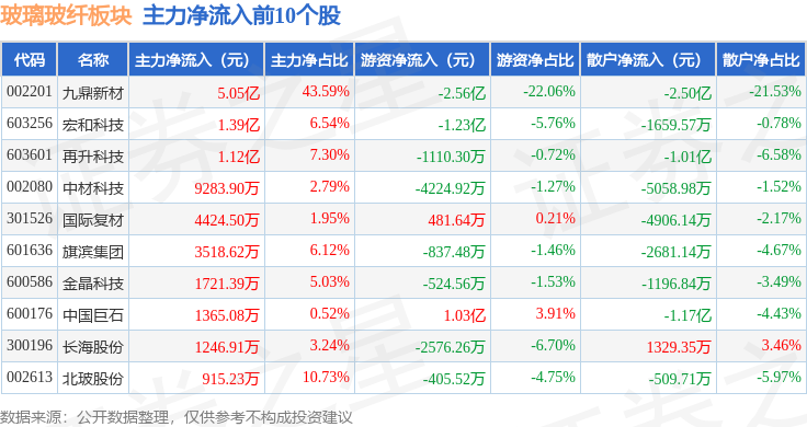 从资金流向上来看,当日玻璃玻纤板块主力资金净流入9.52亿元,游资资金净流出3.98亿元,散户资金净流出5.54亿元。玻璃玻纤板块个股资金流向见下表: