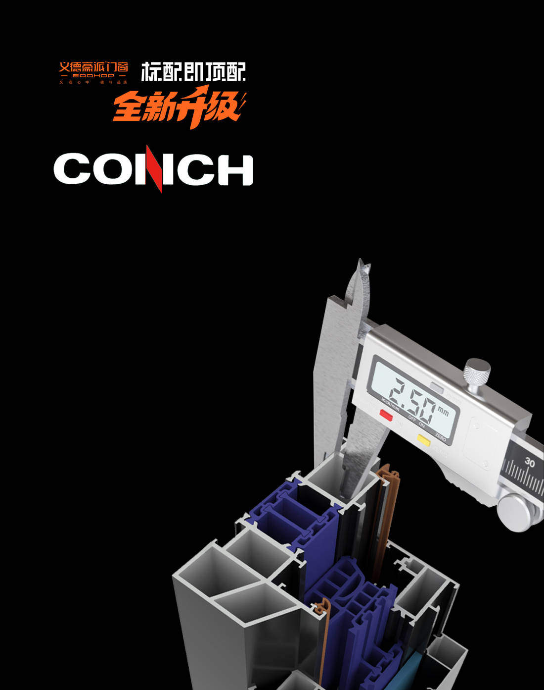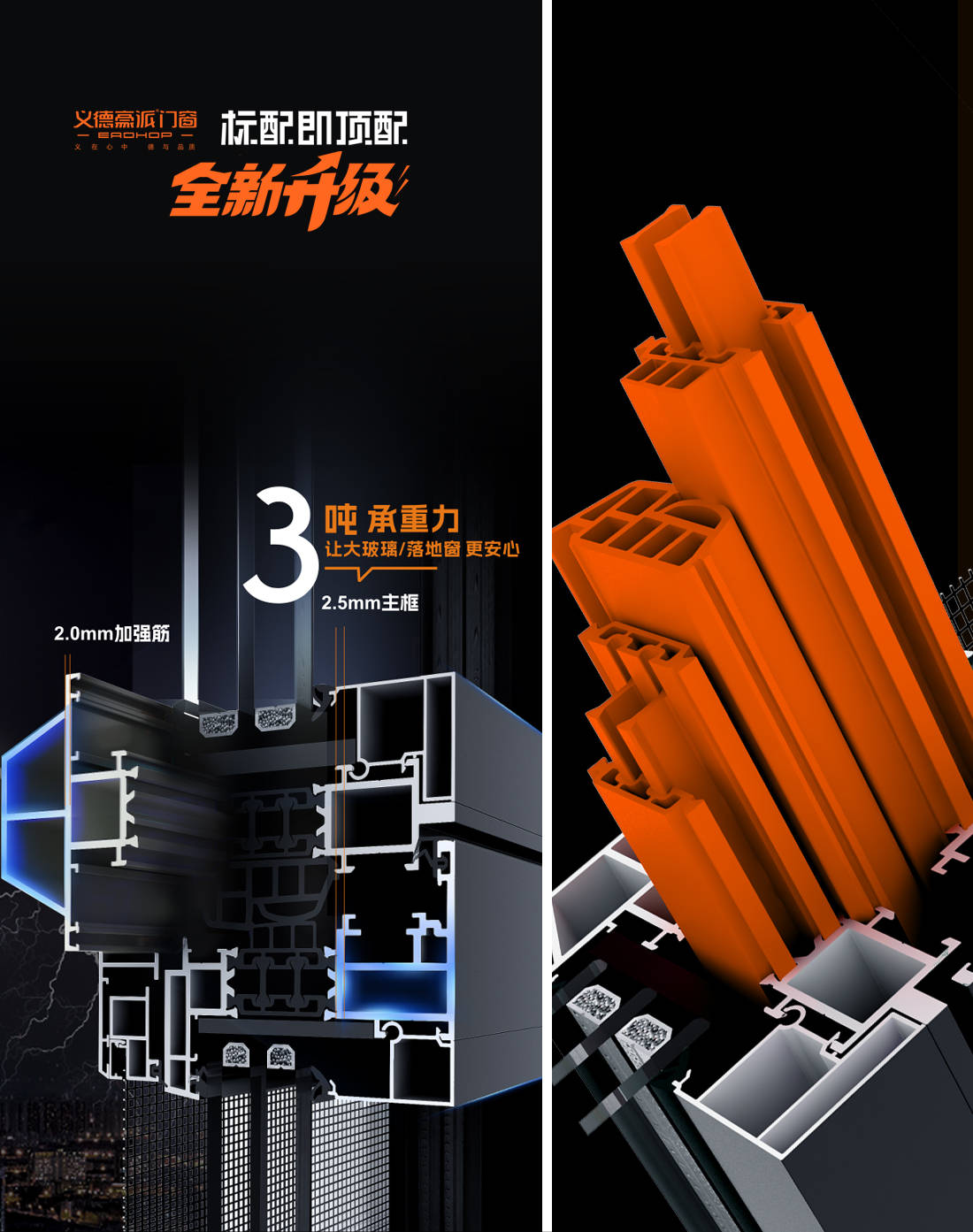 采用十大型材海螺铝材,型材壁厚框型材壁厚2.5mm超国标设计,加强中柱设计,2.0mm加强筋 ,拥有3吨承重力,全面为安全护航。