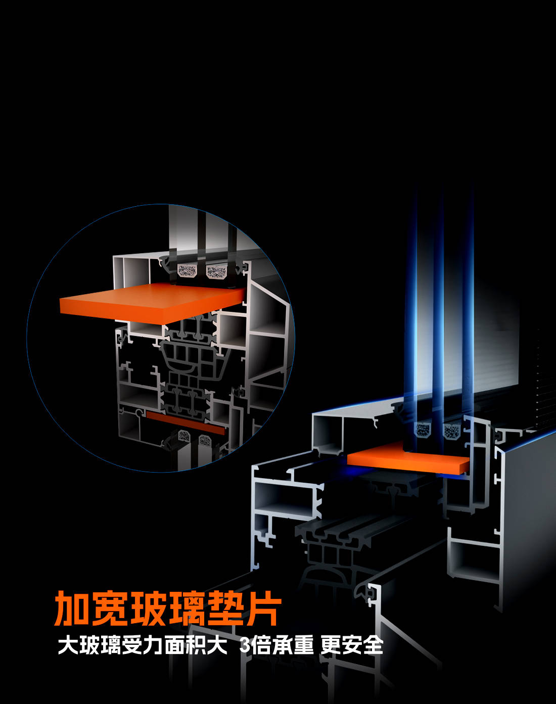 采用加宽高承重玻璃垫片,与传统门窗玻璃垫片(无垫片)相比,大玻璃受力面积更大,将压力分摊到型材上,3倍承重更安全 。