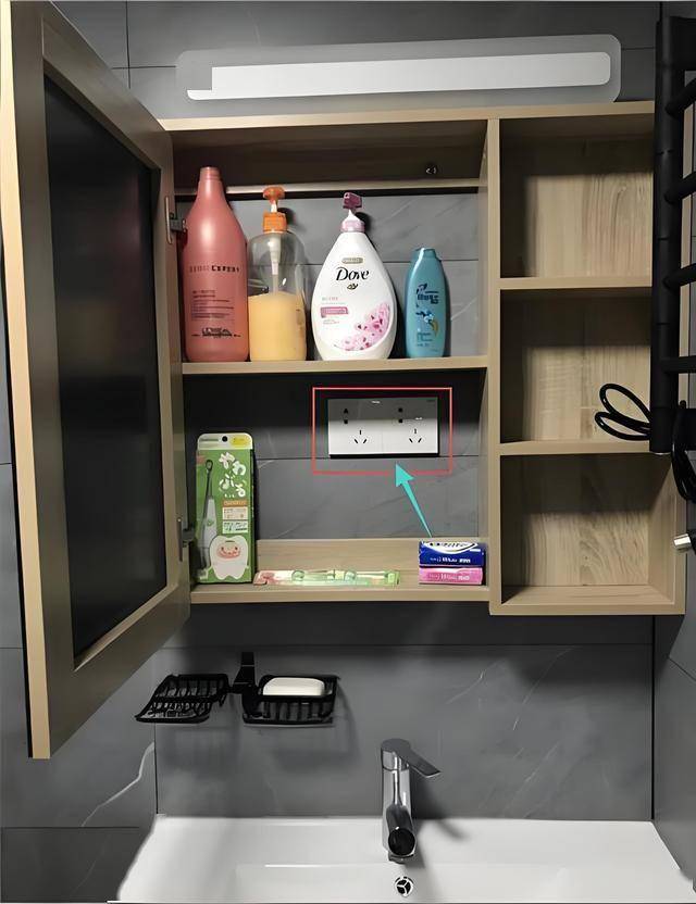 电动牙刷、冲牙器、剃须刀、美容仪……这些小东西充电时,如果镜柜里有个插座,门一关,台面立刻清清爽爽。必须是防溅型,安全不容商量。
